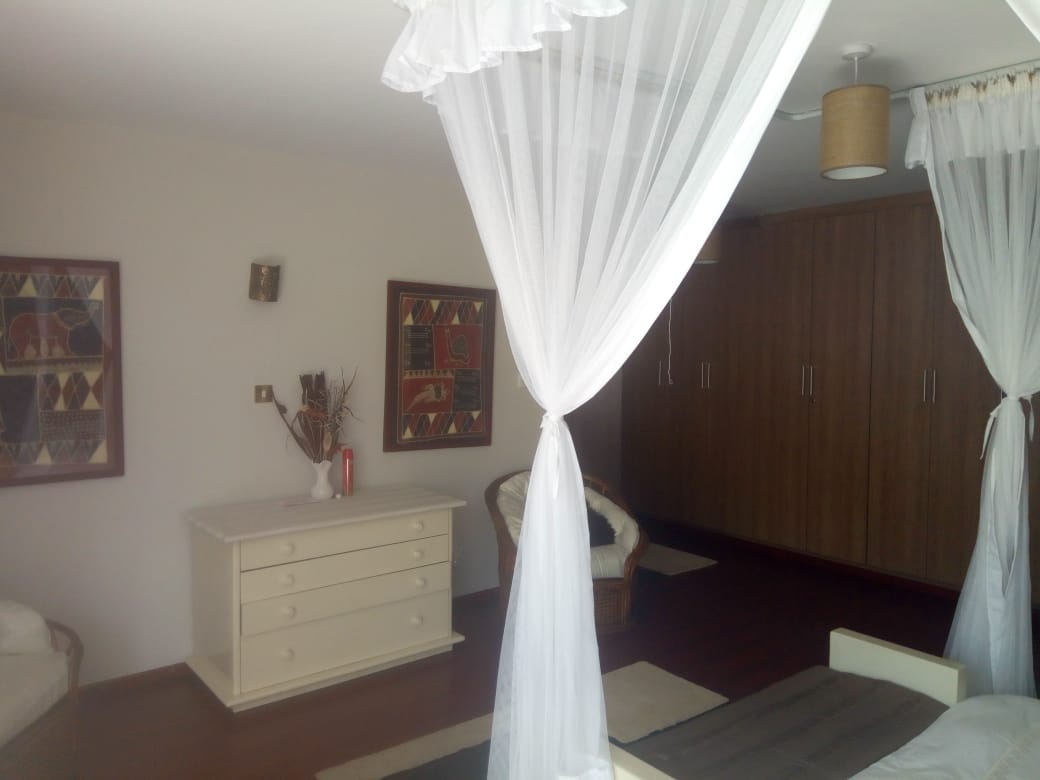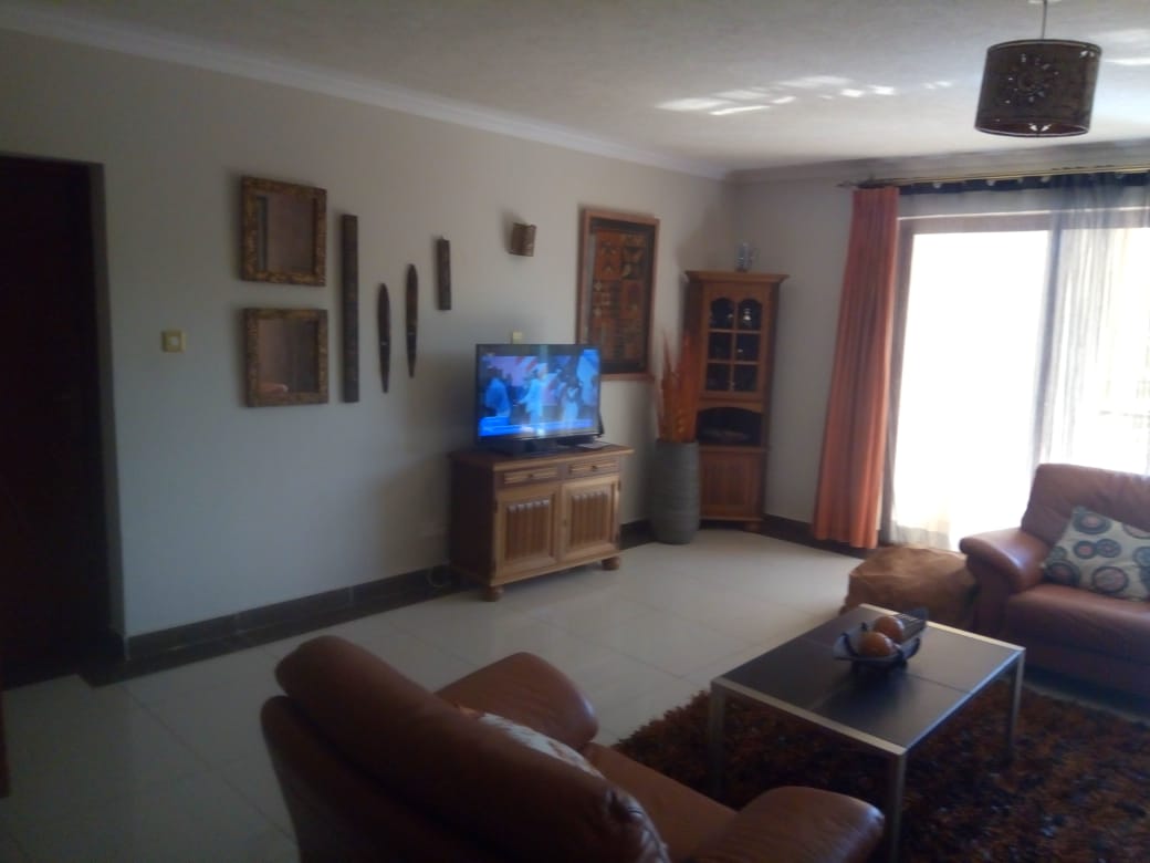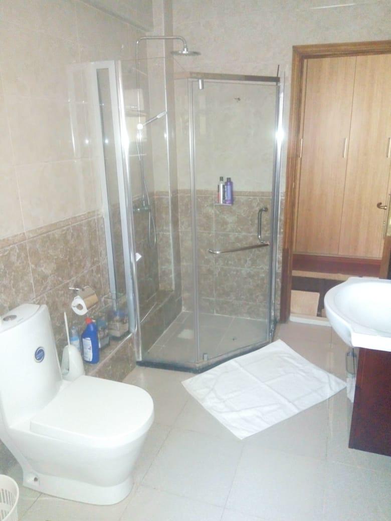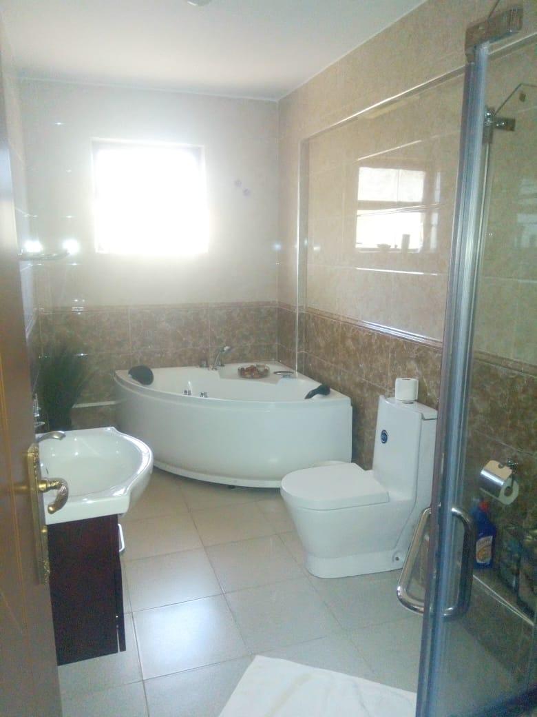 Located on Mugoiri road in Kileleshwa is this stunning 3 bedroom (all en suite) plus domestic staff quarter apartment on the 3rd floor level. The lounge is spacious with a floor to ceiling glass sliding door opening to a small balcony. The dinning section is also spacious and easily accommodates a 10 sitter dinning table and leaves lots of room around it. The kitchen is open plan and equally spacious and has hood fitted above the stove area. The kitchen back door opens to a huge laundry area and the back access to the d sq. There is a separate visitor cloakroom before the passage to the bedrooms. The bedrooms are spacious and accommodate acres of wardrobe storage space and each is en suite. The main bedroom bath has both a shower cubicle and a bathtub.